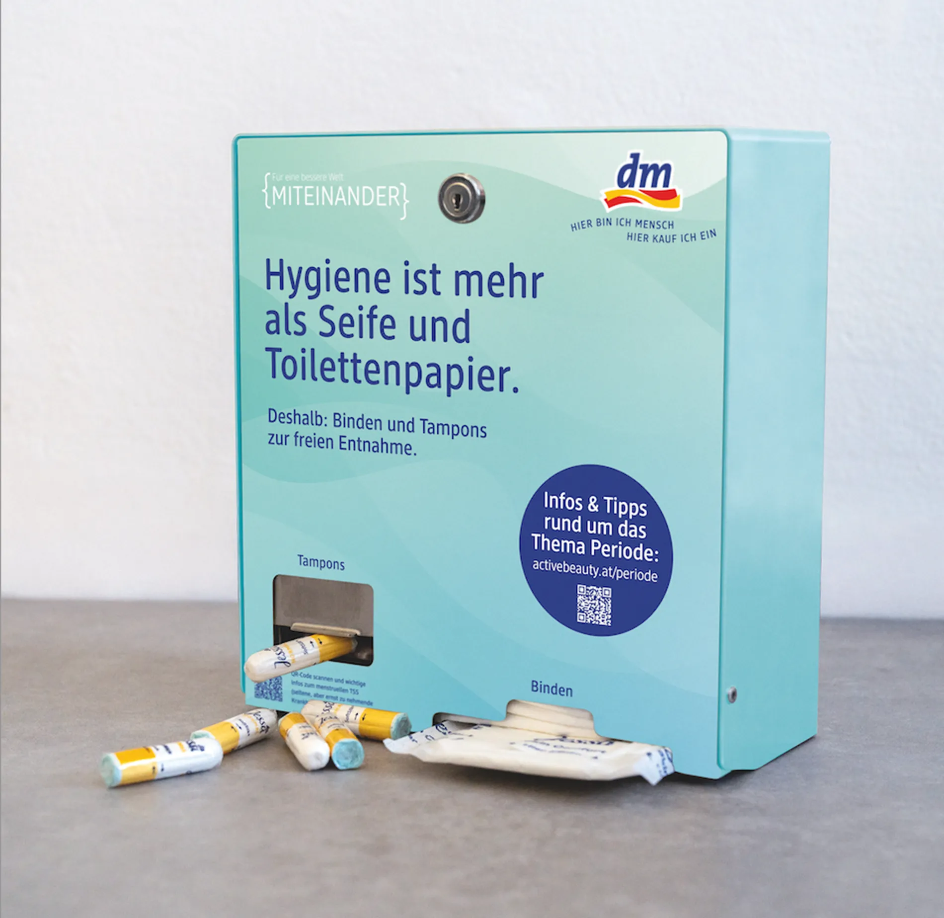 Aus diesem Grund stellt dm 500 Periodenproduktspender inkl. Erstausstattung an Tampons und Binden für Bildungseinrichtungen im ganzen Land kostenlos zur Verfügung.