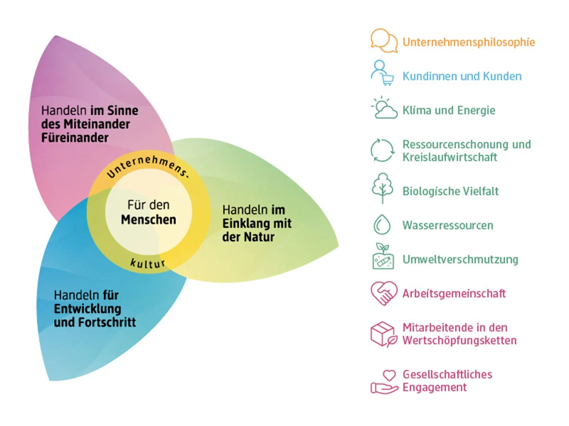 Jedes Thema wird durch Teilstrategien und messbare Ziele unterlegt. Im jährlichen Ziel- und Planungsprozess prüft die Geschäftsführung die Fortschritte und nimmt bei Bedarf Anpassungen vor.