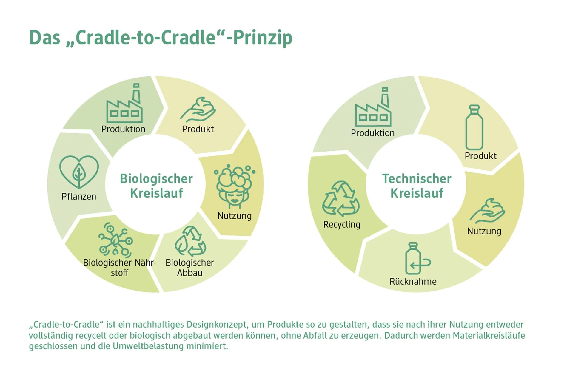 Kreislaufwirtschaft endet nicht an der Kasse. Der entscheidende Schritt passiert nach Nutzung: Nur korrekt getrennte Materialien können recycelt und in Kreisläufe zurückgeführt werden. Darum werden auf Verpackungen mehrsprachige Trennhinweise verwendet, um Verbraucher bei der richtigen Entsorgung zu unterstützen. Falsch entsorgte Materialien verlieren ihren Wert – korrekt getrennt bleiben sie im Kreislauf. Durch die Implementierung des „Cradle-to-Cradle“-Prinzips möchten wir geschlossene Materialkreisläufe schaffen. Ziel ist es, Produkte und Verpackungen so zu gestalten, dass sie nach ihrer Nutzung wieder in den biologischen oder technischen Kreislauf zurückgeführt werden können.